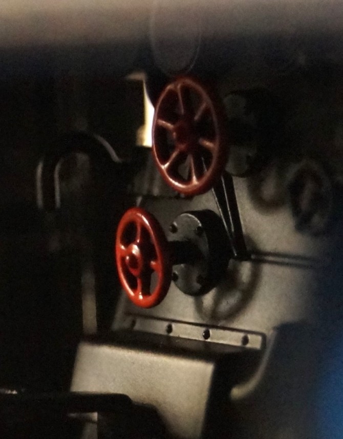 Der Arbeitsplatz des Lokführers ist höchst detailliert nach gebildet. Alle Instrumente sind sind vorbildgerecht nachgebildet, alle Bedienelemente wie Handräder, Hebel und Ähnliches entsprechen exakt dem Vorbild. Die Flammen in der Feuerbüchse sind durch das per LED nachgestellte Revisionsglas sichtbar. Auch am Boden der Feuerbüchse blitzt das Feuer wie beim Vorbild von Zeit zu Zeit durch.